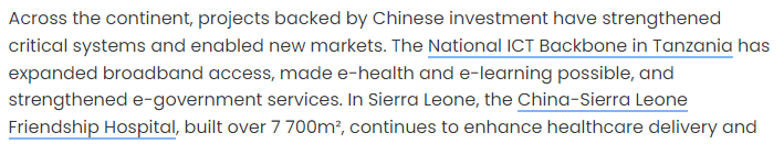 文章說(shuō),中國(guó)在非洲投資支持的項(xiàng)目夯實(shí)了關(guān)鍵系統(tǒng)根基,催生了新興市場(chǎng)。文章舉例說(shuō),坦桑尼亞的國(guó)家信息通信技術(shù)寬帶骨干網(wǎng)項(xiàng)目顯著拓寬了寬帶覆蓋范圍,讓線上醫(yī)療和線上學(xué)習(xí)成為可能,并強(qiáng)化了電子政務(wù)服務(wù)體系;塞拉利昂的中塞友好醫(yī)院持續(xù)提升當(dāng)?shù)氐尼t(yī)療服務(wù)水平,在抗擊埃博拉疫情期間發(fā)揮了關(guān)鍵作用……文章說(shuō),這些項(xiàng)目的故事或許不會(huì)成為西方媒體的頭條新聞,但它們實(shí)實(shí)在在提振了市場(chǎng),培養(yǎng)了勞動(dòng)技能,為非洲企業(yè)的蓬勃發(fā)展創(chuàng)造了條件。