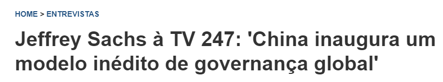巴西247新聞網(wǎng)近日刊登一篇文章,介紹了世界知名學(xué)者杰弗里·薩克斯接受巴西247電視臺(tái)專(zhuān)訪時(shí),對(duì)中國(guó)提出的全球治理倡議予以高度評(píng)價(jià)。他認(rèn)為,“中國(guó)開(kāi)創(chuàng)了前所未有的全球治理模式”。