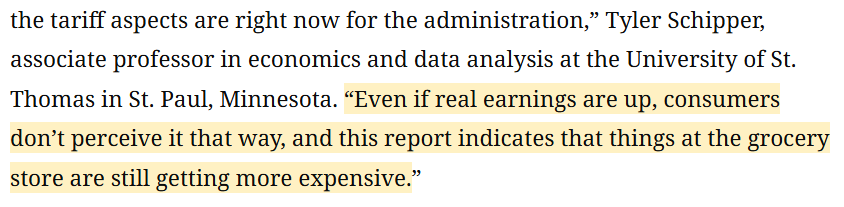 經(jīng)濟(jì)學(xué)家泰勒 施皮珀(Tyler Schipper)直言:“老百姓感受不到工資上漲,他們只知道超市商品的價(jià)格越來(lái)越貴?!?/p>