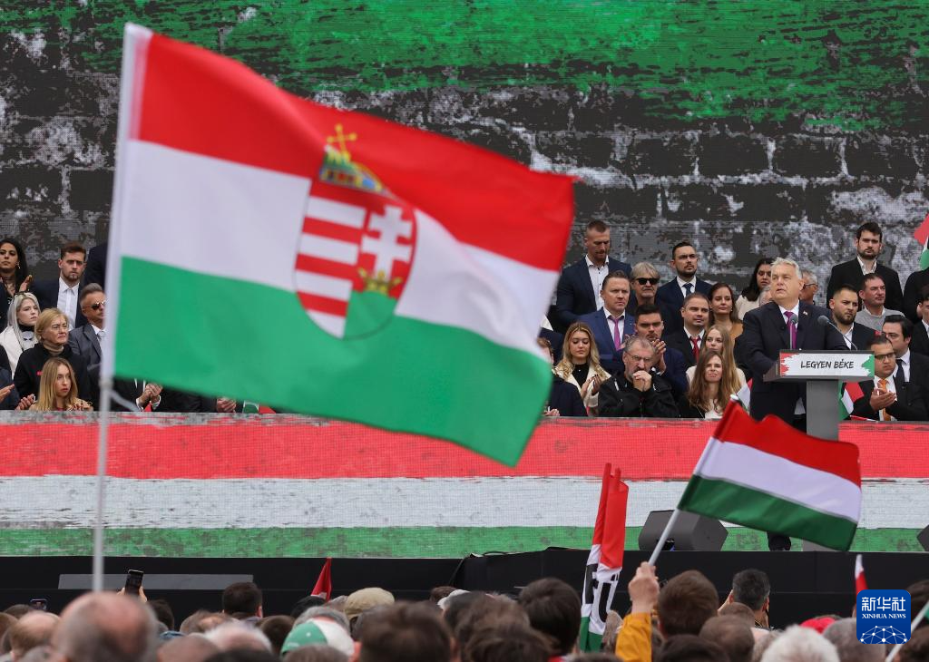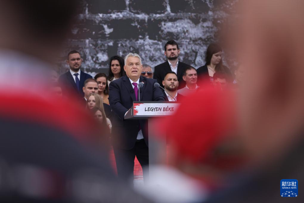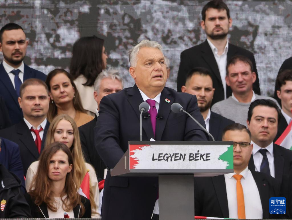 10月23日,匈牙利總理歐爾班(前右)在首都布達佩斯舉行的一場集會上講話。新華社發(fā)(弗爾季·奧蒂洛攝)