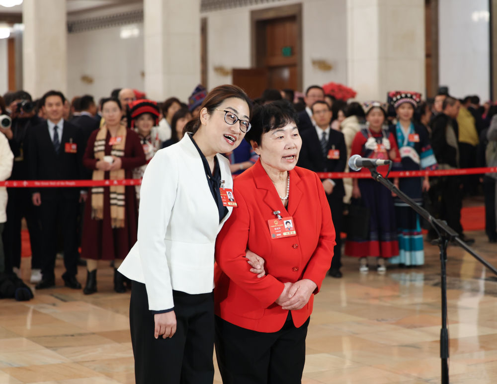 3月8日,第十四屆全國人民代表大會(huì)第三次會(huì)議第二場“代表通道”集中采訪活動(dòng)在北京人民大會(huì)堂舉行。這是全國人大代表盛弘(左)和楊寶玲向廣大婦女致以節(jié)日祝福。新華社記者 呂帥 攝