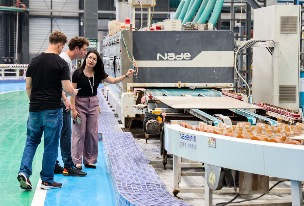 2025年4月22日,兩名參加廣交會(huì)的阿根廷采購(gòu)商專程來(lái)到佛山參觀蒙娜麗莎大尺寸陶瓷巖板自動(dòng)生產(chǎn)線。新華社記者 劉大偉 攝