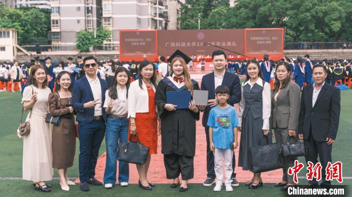 在廣西科技大學27日舉行的畢業(yè)典禮上,老撾留學生馬麗文成為全場焦點:她的父母、兄弟等十位親人跨國而來,見證這一重要時刻。“當家人手捧鮮花向我走來,我緊緊擁抱住他們,感謝他們支持我的夢想?!瘪R麗文說。