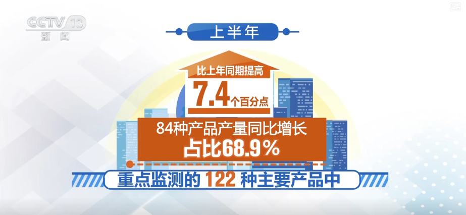 上半年,重點(diǎn)監(jiān)測(cè)的122種主要產(chǎn)品中,84種產(chǎn)品產(chǎn)量同比增長(zhǎng),占比68.9%,比上年同期提高7.4個(gè)百分點(diǎn)。