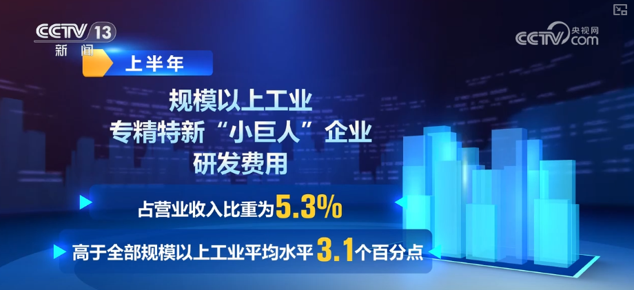 此外,中小企業(yè)創(chuàng)新能力不斷提高。上半年,規(guī)模以上工業(yè)專精特新“小巨人”企業(yè)研發(fā)費(fèi)用占營(yíng)業(yè)收入比重為5.3%,高于全部規(guī)模以上工業(yè)平均水平3.1個(gè)百分點(diǎn),發(fā)展新質(zhì)生產(chǎn)力作用逐漸顯現(xiàn)。