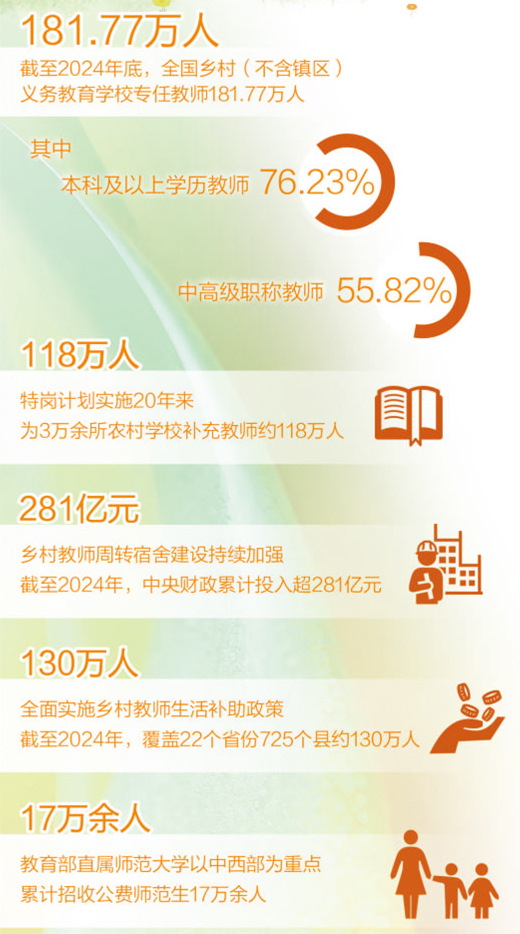 這是真金白銀的投入。2024年,特崗教師工資性補助再次提標,每人每年增加3600元;鄉(xiāng)村教師生活補助政策深入實施,受益教師約130萬人,人均月補助金額約400元;鄉(xiāng)村教師周轉(zhuǎn)宿舍建設(shè)持續(xù)加強,中央財政累計投入超281億元,建設(shè)約63.7萬套。