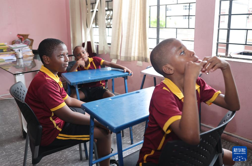 9月4日,在牙買加首都金斯敦艾特特殊教育小學(xué),學(xué)生學(xué)習(xí)中文。新華社記者 李夢馨 攝