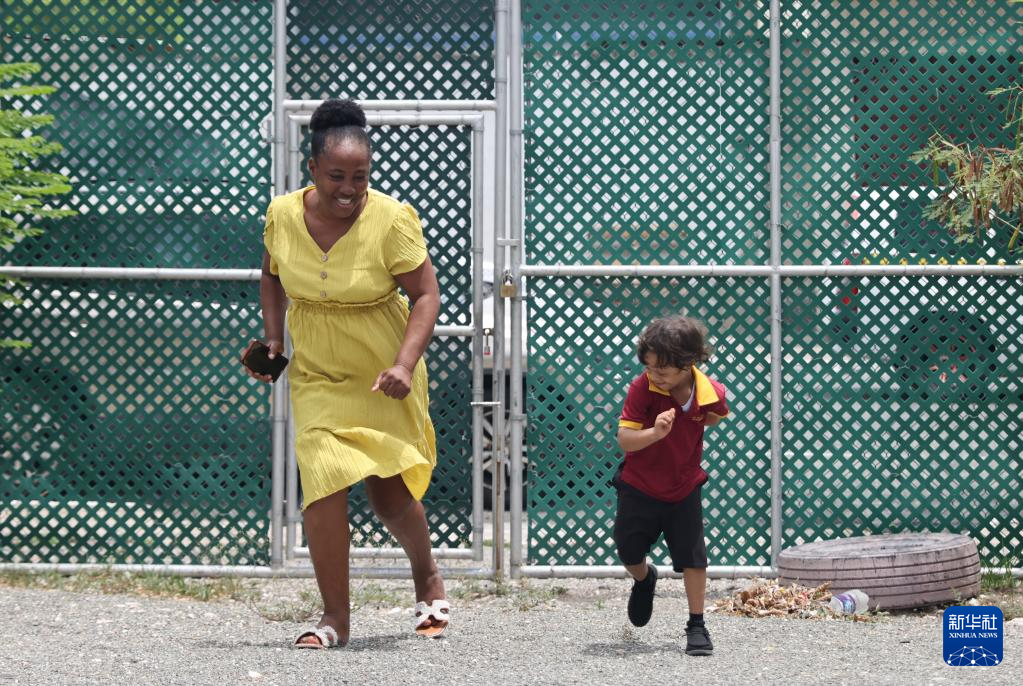 9月4日,在牙買加首都金斯敦艾特特殊教育小學(xué),老師陪伴學(xué)生在操場玩耍。新華社記者 李夢馨 攝