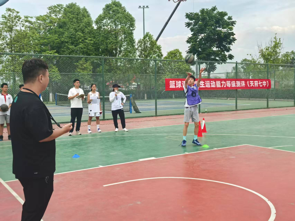 走進(jìn)成都天府第七中學(xué)體育館,墻上張貼著足球、籃球、排球等項(xiàng)目的課程運(yùn)動能力等級標(biāo)準(zhǔn),十分醒目。學(xué)生們正按照標(biāo)準(zhǔn)要求進(jìn)行籃球練習(xí),他們一邊觀察墻上的動作示意圖,一邊調(diào)整手型和力度,控制籃球的反彈高度和節(jié)奏。