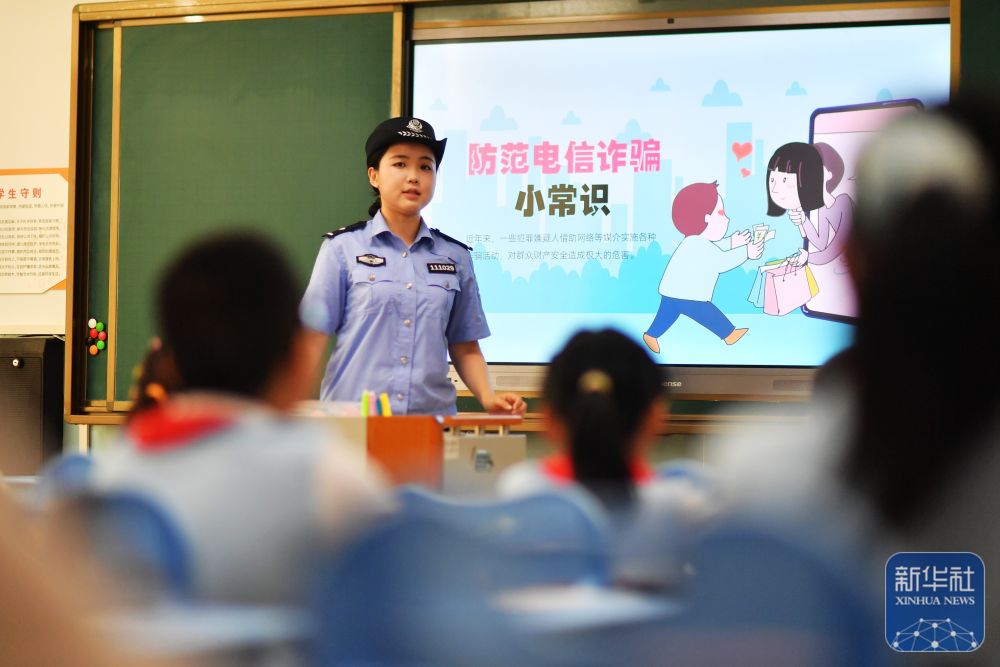 9月15日,在山東省榮成市府新小學(xué)教室內(nèi),轄區(qū)民警通過案例講解為學(xué)生們普及網(wǎng)絡(luò)安全和防詐騙知識。新華社發(fā)(李信君攝)
