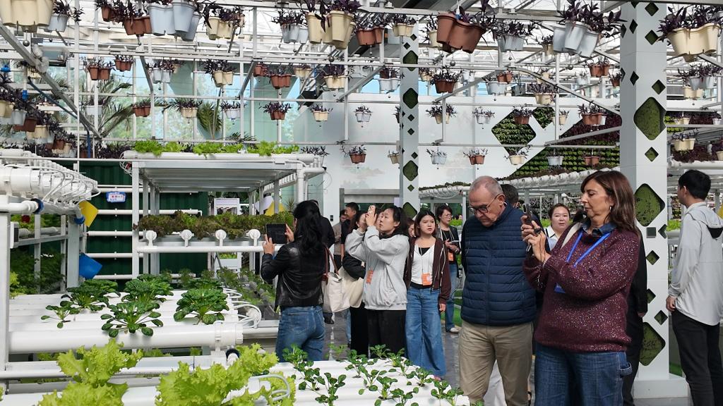 走進(jìn)昌吉新疆農(nóng)業(yè)博覽園內(nèi)的垂直農(nóng)業(yè)展示區(qū)、葉菜工廠示范區(qū)和果菜工廠示范區(qū),目睹無土栽培、無人機灌溉、光合作用智能調(diào)控等一系列農(nóng)業(yè)高科技應(yīng)用為作物“量身定制”生長環(huán)境,參訪議員們紛紛拍照記錄。