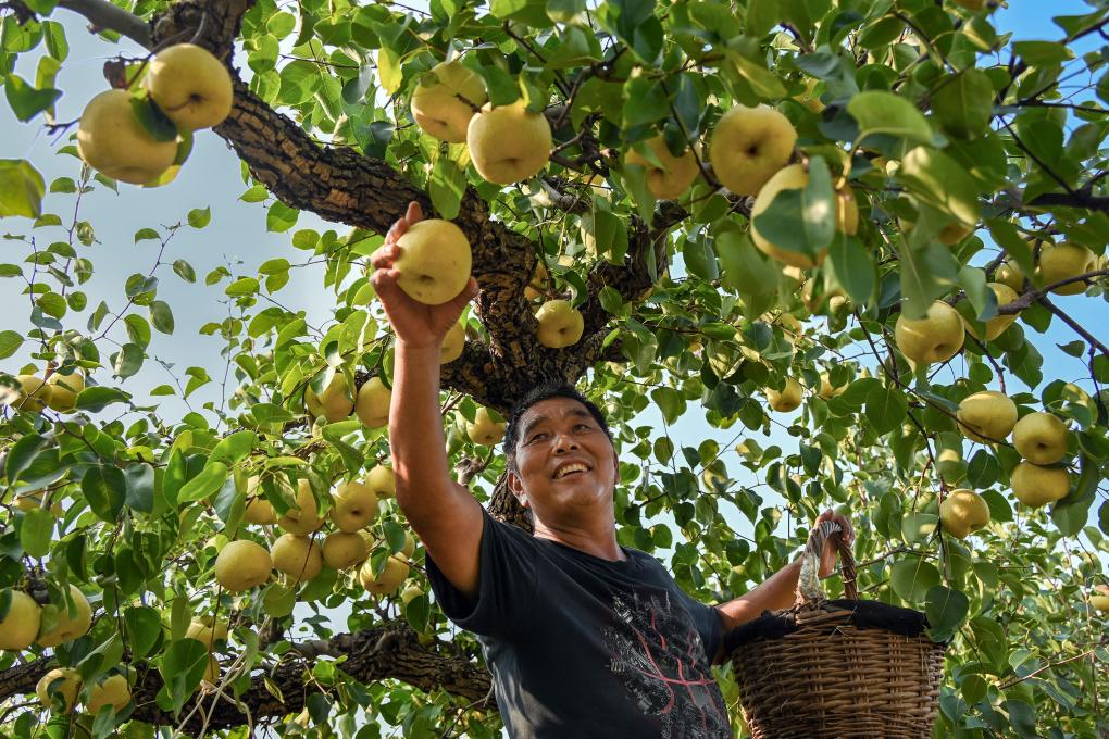 9月15日,在安徽省宿州市碭山縣一處梨園內(nèi),梨農(nóng)在采摘酥梨。新華社發(fā)(崔猛 攝)