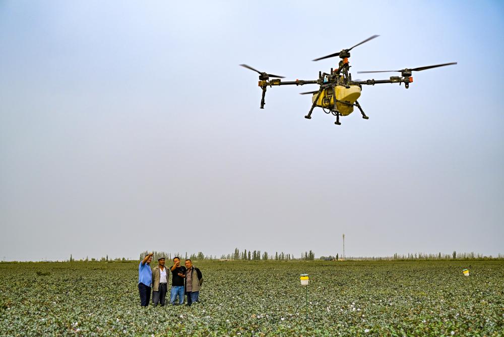 9月19日,極飛超級(jí)棉田負(fù)責(zé)人艾海鵬(右二)在尉犁縣的示范棉田里為達(dá)西村村民進(jìn)行智能無人機(jī)灑藥培訓(xùn)。無人化智慧農(nóng)場應(yīng)用農(nóng)業(yè)無人機(jī)、農(nóng)業(yè)無人車、遙感無人機(jī)、農(nóng)機(jī)自駕儀等系列物聯(lián)設(shè)備實(shí)施“水肥一體化”管理,農(nóng)民用一部手機(jī)即可操作智能設(shè)備完成多項(xiàng)田間管理工作。