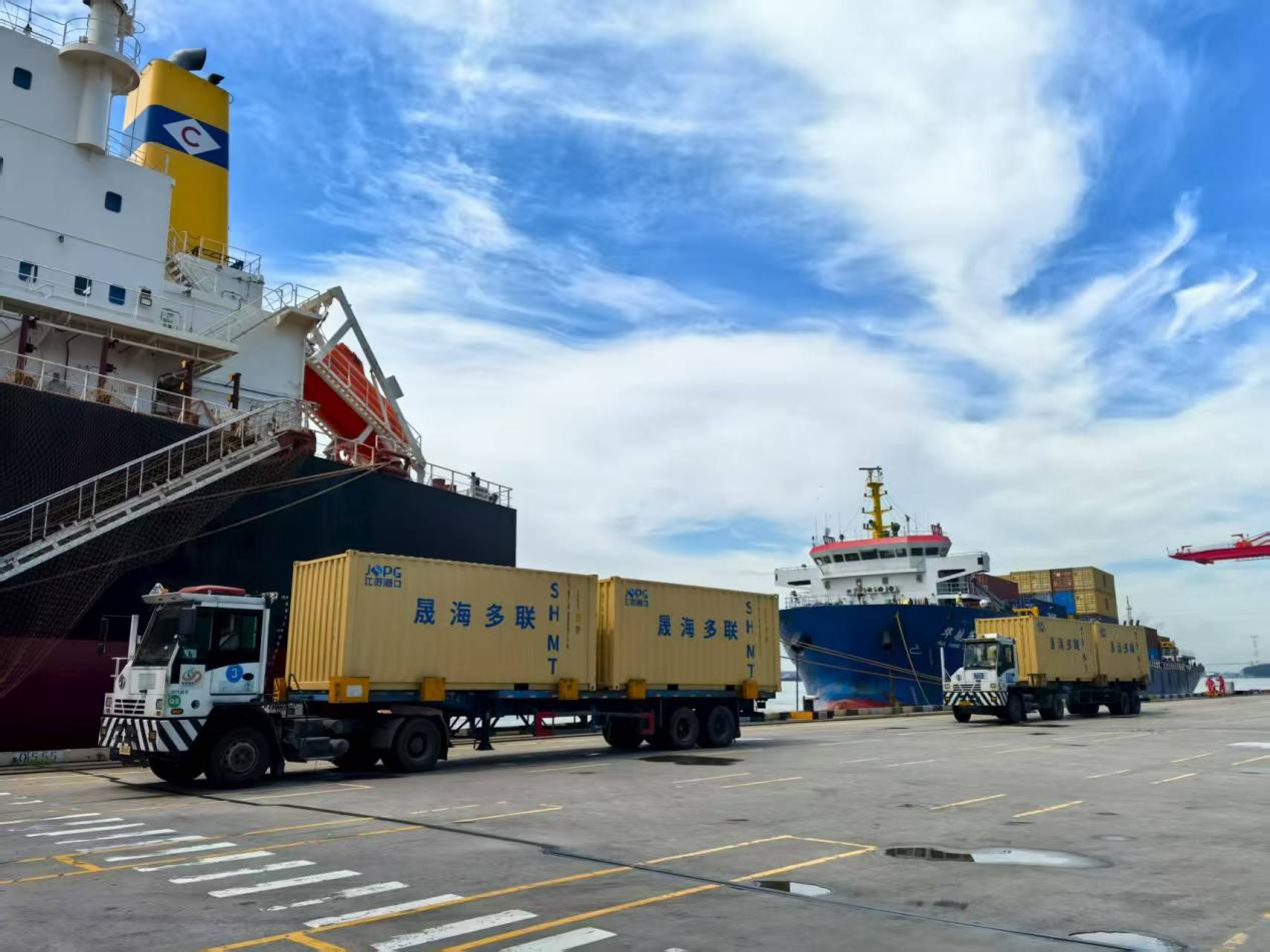 在智慧港口軟硬件升級的同時,物流運輸模式的創(chuàng)新同樣成為“水運江蘇”提質(zhì)增效降本的關(guān)鍵引擎。走進龍?zhí)惰F路堆場,只見滿載煤炭的35噸敞頂箱經(jīng)鐵路專列直抵港區(qū),“集改散”吊具精準抓箱,液壓翻轉(zhuǎn)卸煤,煤炭直輸貨輪。同時,滿載集裝箱的“南京-洋山”沿江海鐵班列正整裝待發(fā),即將駛向上海洋山港銜接國際干線班輪。整個鐵水聯(lián)運流程高效銜接,一氣呵成。這正是江蘇港口物流集團晟海公司創(chuàng)新打造的多元化聯(lián)運新格局。
