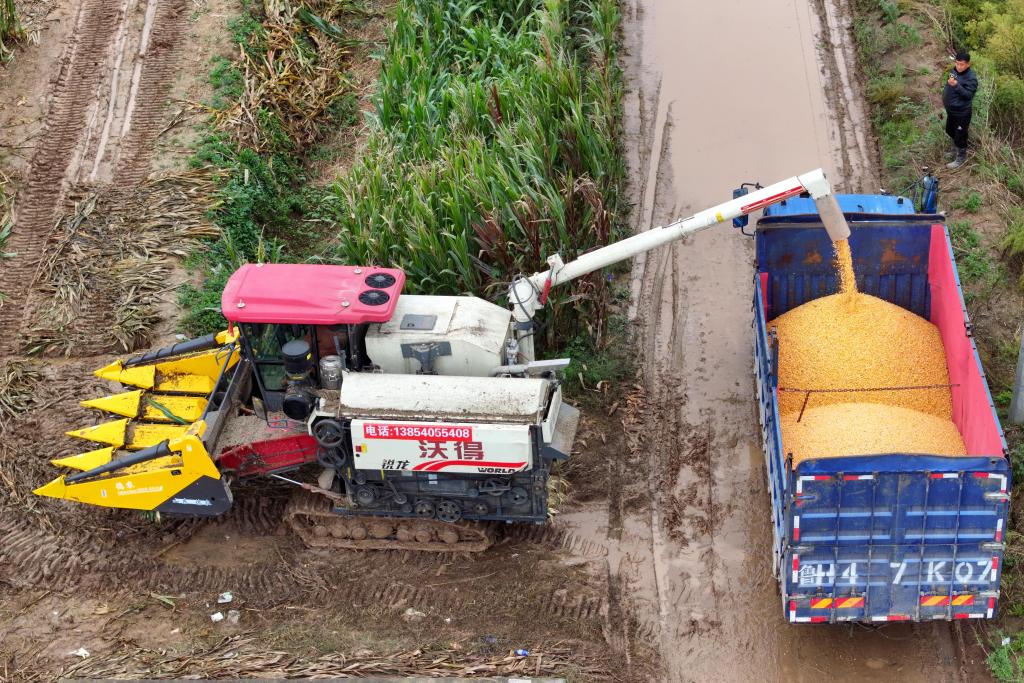 2025年10月11日,在安徽省淮北市濉溪縣百善鎮(zhèn)張莊村,從河南駐馬店調(diào)運(yùn)過來的履帶式收割機(jī)在收割玉米。新華社發(fā)(徐弘揚(yáng) 攝)