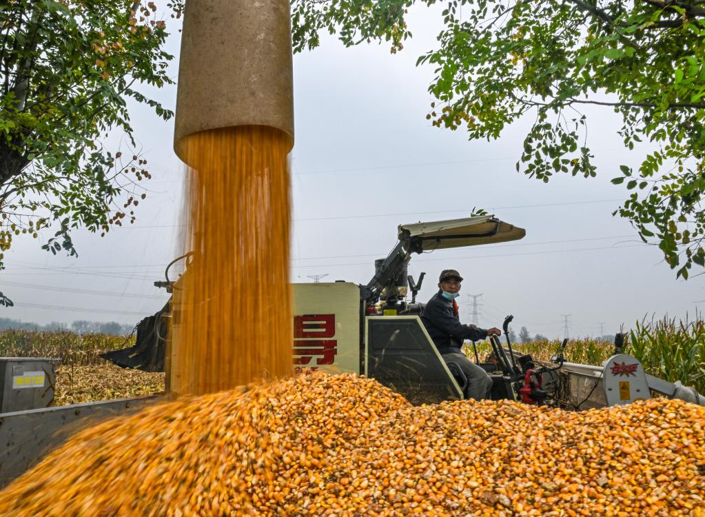 2025年10月8日,河南省商丘市夏邑縣會亭鎮(zhèn)郭樓村農(nóng)民駕駛收割機(jī)收獲玉米。新華社發(fā)(王高超 攝)