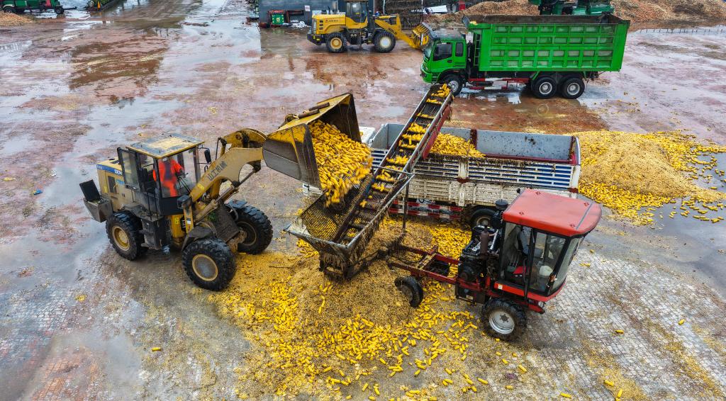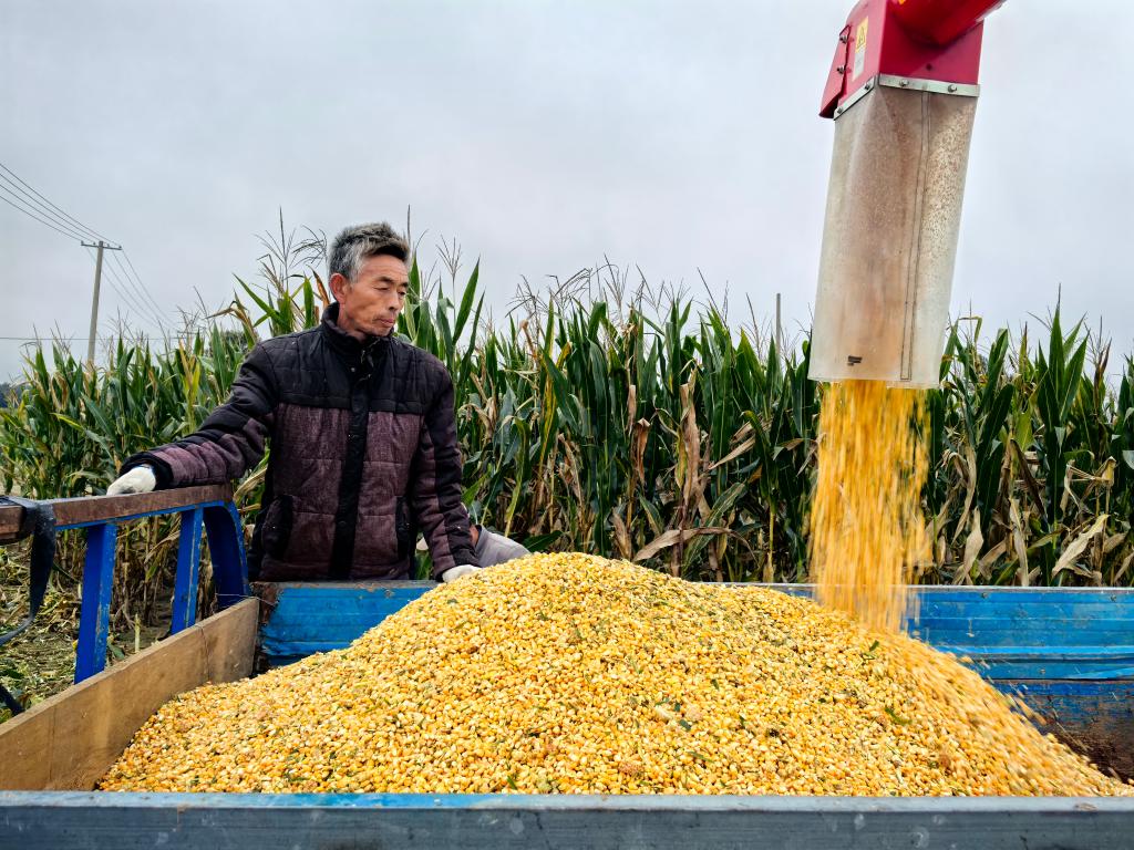 在菏澤市曹縣蘇集鎮(zhèn)一處農(nóng)田旁,收獲的玉米正在裝車(chē)。新華社記者葉婧 攝