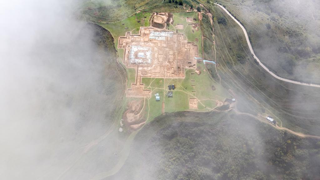 這是10月15日拍攝的甘肅省隴南市禮縣四角坪遺址考古發(fā)掘現(xiàn)場(無人機(jī)照片)。新華社記者 陳斌 攝