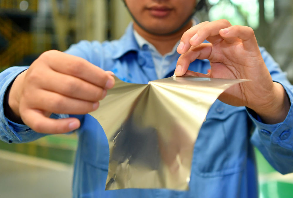 在位于山西的太鋼集團,員工展示用手撕開0.02毫米厚的超薄帶狀不銹鋼(2019年5月24日攝)。