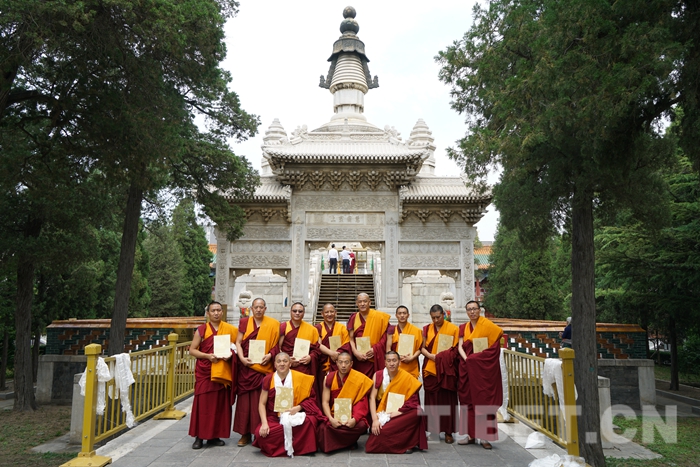 圖為中國藏語系高級(jí)佛學(xué)院第十四屆格魯派“拓然巴”學(xué)銜獲得者在西黃寺清凈化城塔前合影留念。后排右三為本文作者日巴。