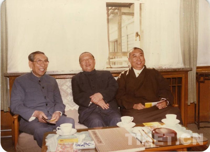 圖為1987年初,十世班禪大師與習(xí)仲勛、阿沛?阿旺晉美商議援助西藏發(fā)展基金會籌備事宜。