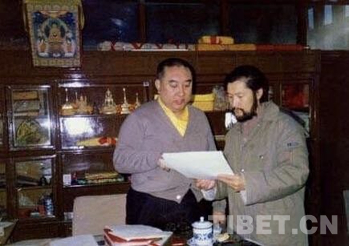 圖為1987年初,十世班禪大師和畫家洛松向秋探討援助西藏發(fā)展基金會徽標(biāo)事宜。