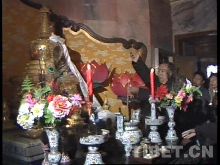 圖為1987年4月,十世班禪大師和阿沛?阿旺晉美率領(lǐng)援助西藏發(fā)展基金會籌備委員會委員朝拜靈光寺佛牙舍利塔,并親自敬獻哈達。