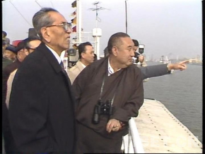 圖為1987年4月19日,十世班禪大師和阿沛?阿旺晉美率領(lǐng)援助西藏發(fā)展基金會籌備委員會委員考察天津港。