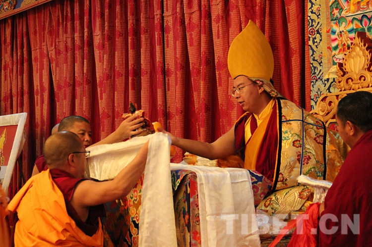 圖為土多申格副院長帶領(lǐng)經(jīng)師代表和學(xué)員代表,虔誠地向十一世班禪敬獻曼扎、佛像、佛塔、佛經(jīng)。攝影:孫健