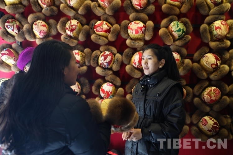 圖為店主嘎珍正在為顧客介紹次仁金果(藏式帽子) 攝影:呂靜
