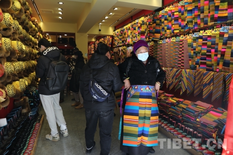 在去八廓街的路上,街邊的一家藏裝店吸引了記者的目光,店內的藏裝款式多樣,邦典色彩艷麗、種類繁多,一排排的次仁金果(藏式帽子)做工精細、款式新穎,在陽光的照耀下金光閃閃,十幾平米的小店顧客盈門。