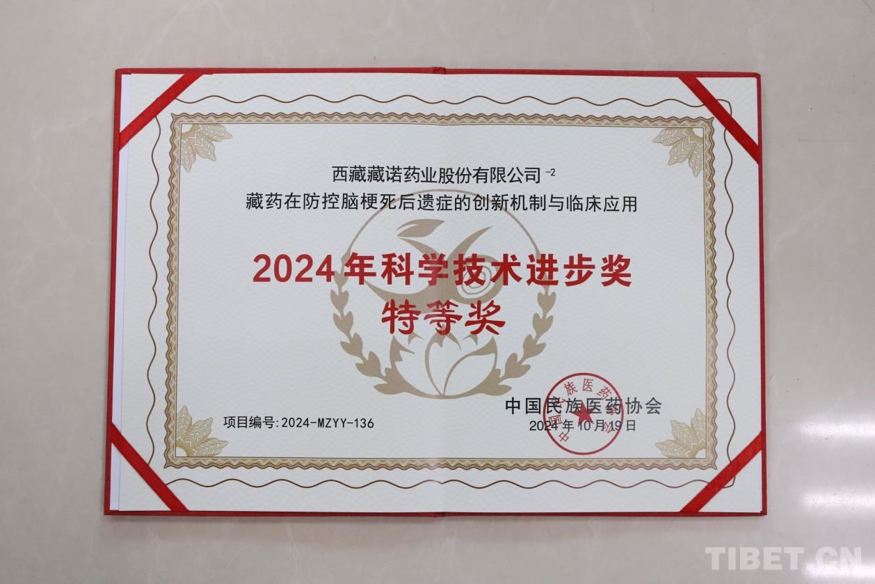 經(jīng)過申報、內審和組織有院士、國醫(yī)大師等各民族專家組成的專家委員會初評、終評、公示、報備等環(huán)節(jié)和程序,由河北醫(yī)科大學第二醫(yī)院、西藏藏諾藥業(yè)股份有限公司、石家莊藏諾藥業(yè)股份有限公司聯(lián)合申報的《藏藥在防控腦梗死后遺癥的創(chuàng)新機制與臨床應用》被授予“2024年中國民族醫(yī)藥協(xié)會科學技術進步獎”特等獎。