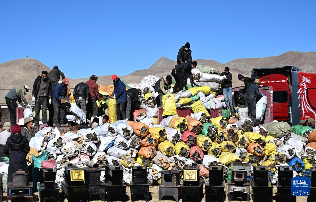 1月9日,受災(zāi)群眾在措布村卸載救災(zāi)物資。新華社記者 李響 攝