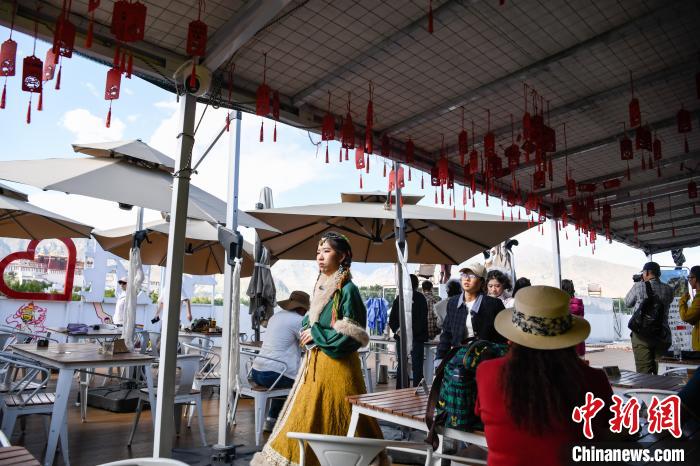 7月7日,游客在西藏拉薩市的一家景觀咖啡廳等待拍攝以布達(dá)拉宮為背景的 “旱地拔蔥” 。中新社記者 貢嘎來(lái)松 攝