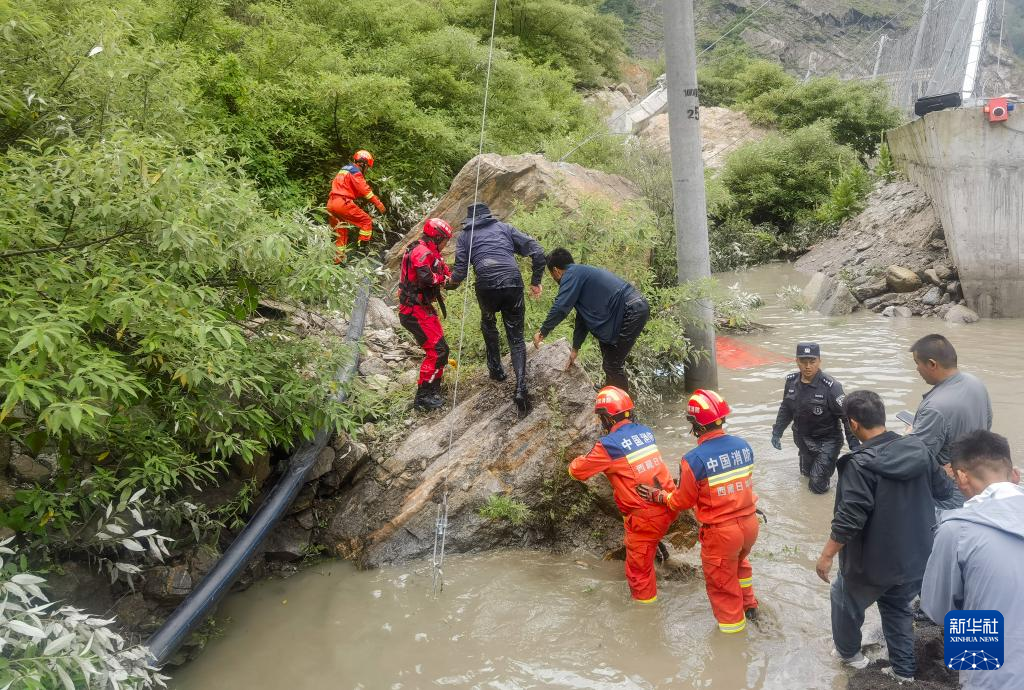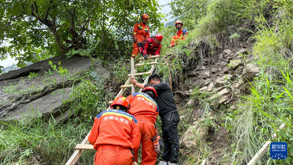 7月8日,西藏消防救援總隊(duì)救援人員在救災(zāi)現(xiàn)場搭建救援通道。新華社發(fā)(徐達(dá)富攝)