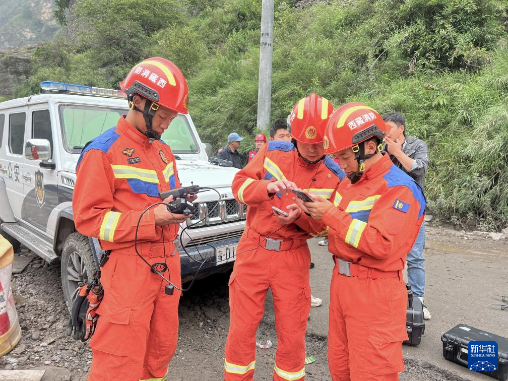 7月8日,西藏消防救援總隊(duì)救援人員在救災(zāi)現(xiàn)場搭建4G單兵圖傳系統(tǒng)。新華社發(fā)(徐達(dá)富攝)