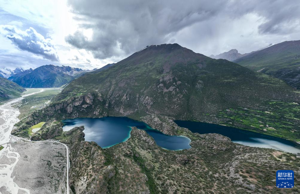 空中俯瞰“三色湖”,從左到右分別為黃湖、黑湖和白湖(7月20日攝,無人機照片)。新華社記者 晉美多吉 攝