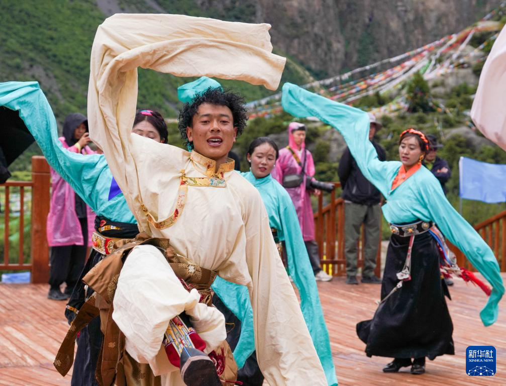 邊壩縣普玉一村的文藝隊演員在“三色湖”觀景臺上為游客表演鍋莊(7月20日攝)。新華社記者 晉美多吉 攝