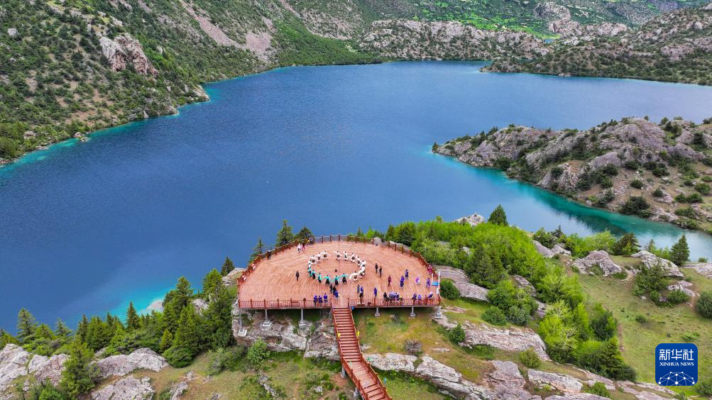 邊壩縣普玉一村的文藝隊演員在“三色湖”觀景臺上為游客表演鍋莊(7月20日攝,無人機照片)。新華社記者 晉美多吉 攝
