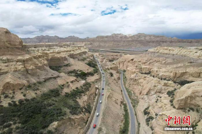圖為9月2日,參加“天上阿里·云巔自駕”活動的游客車隊行駛在札達(dá)縣土林景區(qū)(無人機(jī)照片)。閆志國 攝