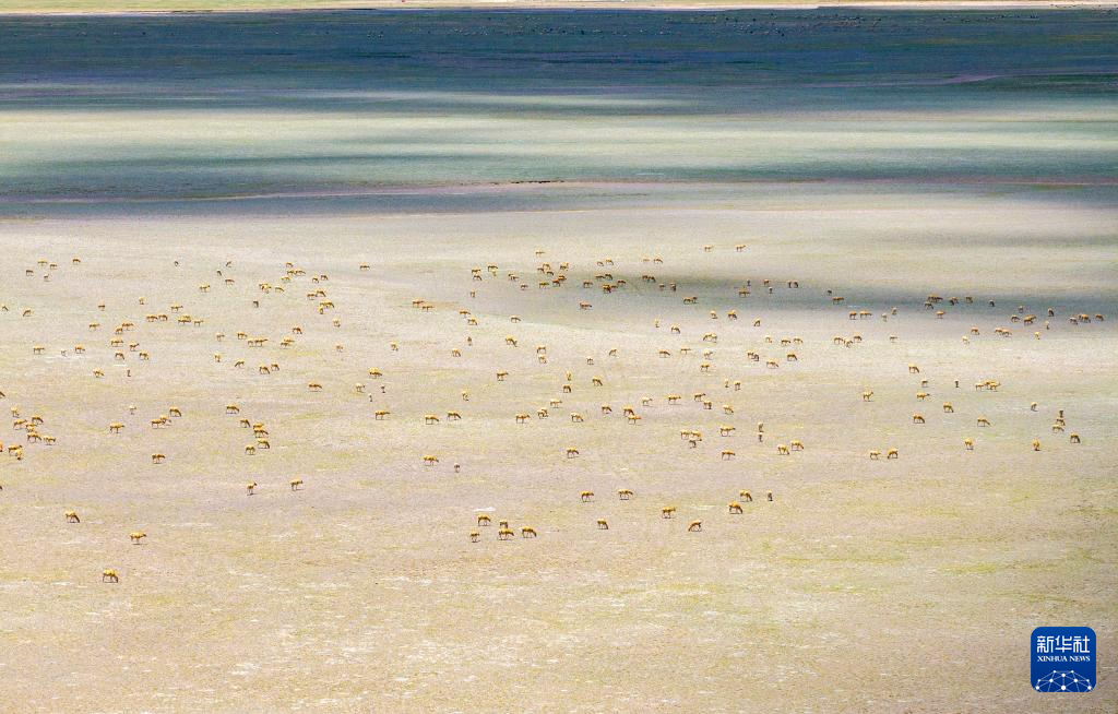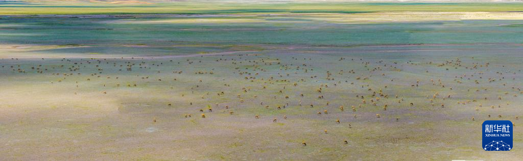 藏羚羊在魯確塘草原集結(jié)(無人機(jī)照片,6月8日攝)。新華社記者 姜帆 攝