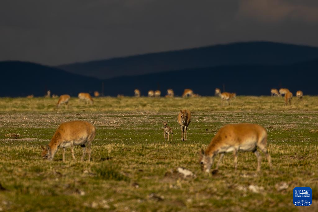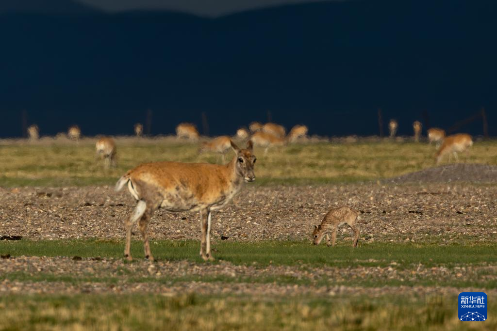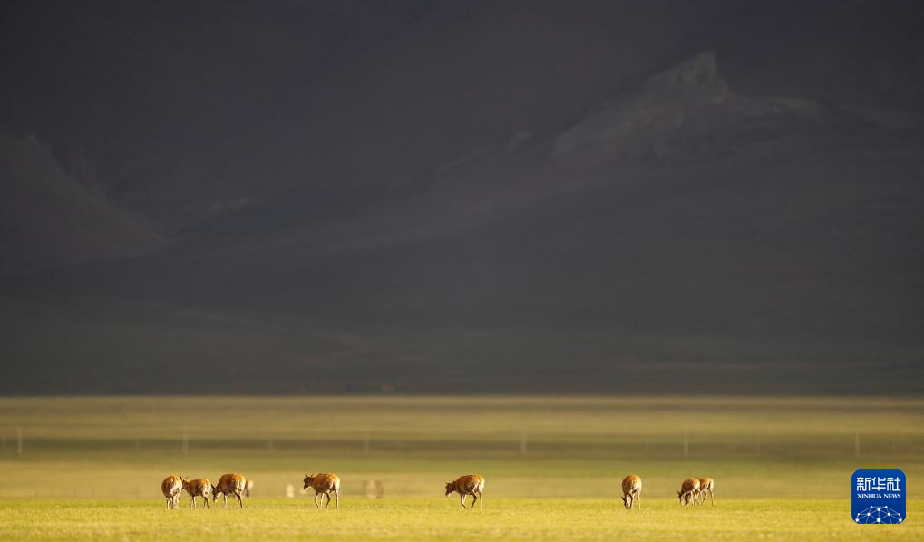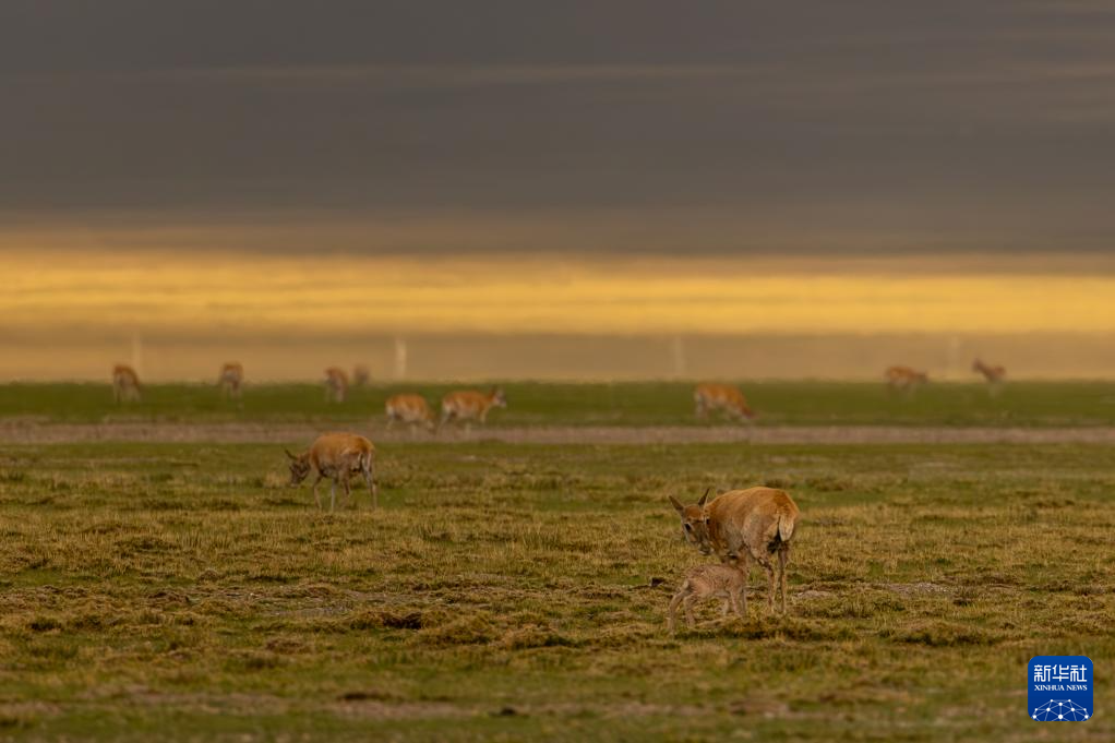 夕陽(yáng)下,母藏羚羊在魯確塘草原上活動(dòng)(6月16日攝)。新華社記者 晉美多吉 攝