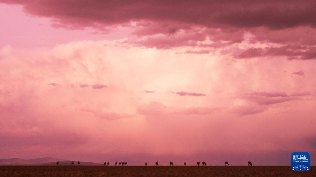 晚霞中魯確塘草原上待產(chǎn)的藏羚羊(6月16日攝)。新華社記者 費(fèi)茂華 攝