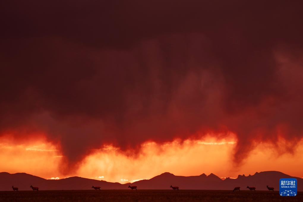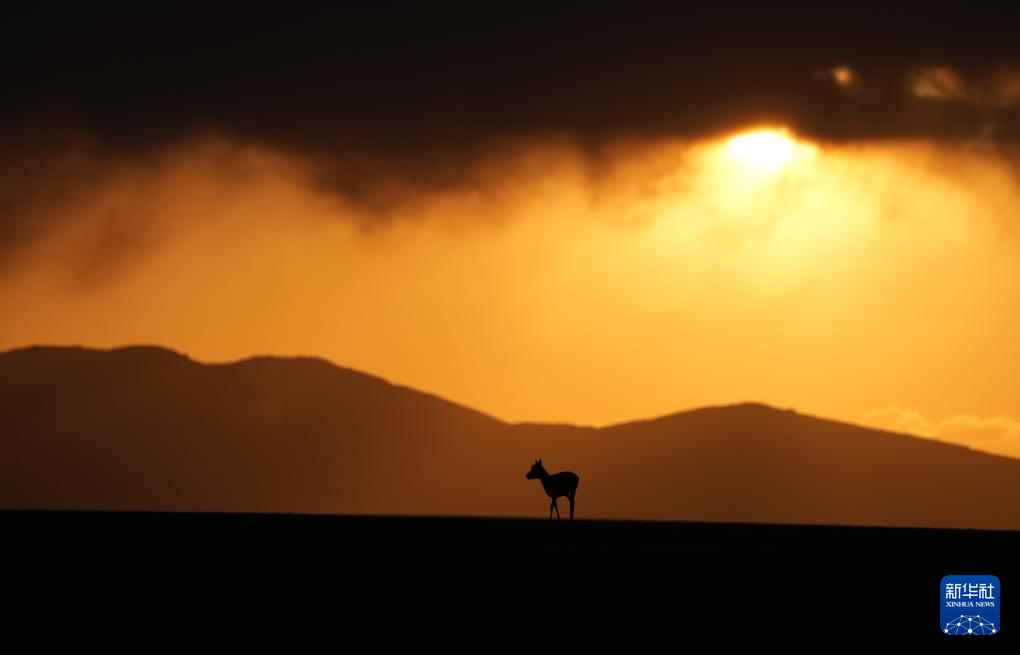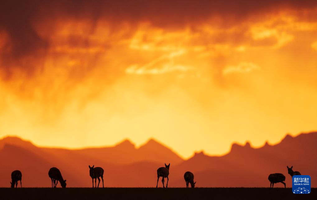 晚霞中待產(chǎn)的藏羚羊(6月16日攝)。新華社記者 費(fèi)茂華 攝