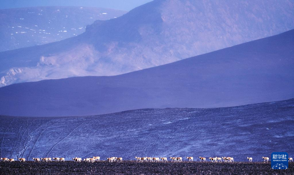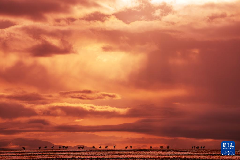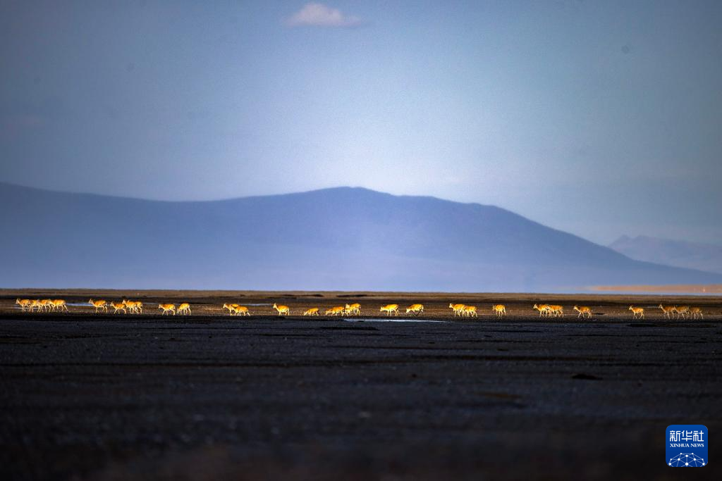 6月13日傍晚,在羌塘國(guó)家級(jí)自然保護(hù)區(qū),一群藏羚羊在遷徙。新華社記者 費(fèi)茂華 攝