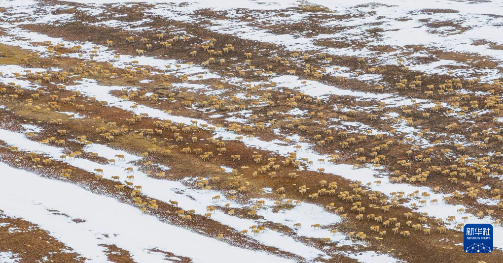 大群遷徙的藏羚羊翻越覆蓋著積雪的山梁(5月10日攝)。新華社記者 姜帆 攝