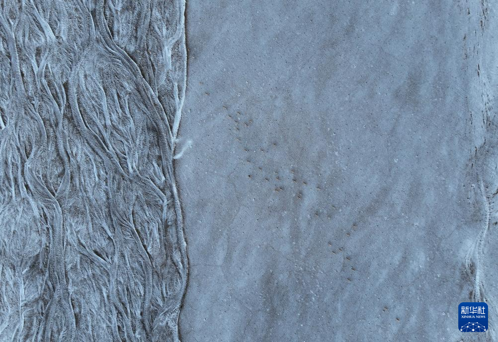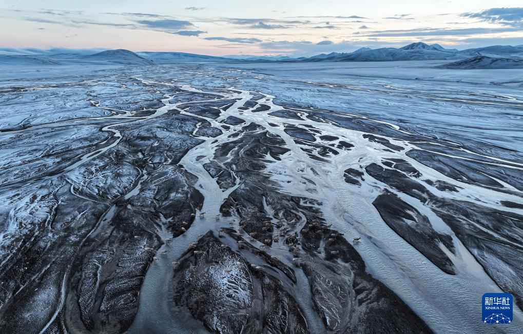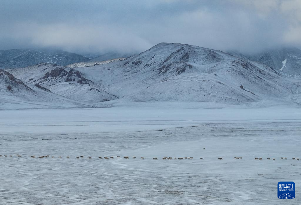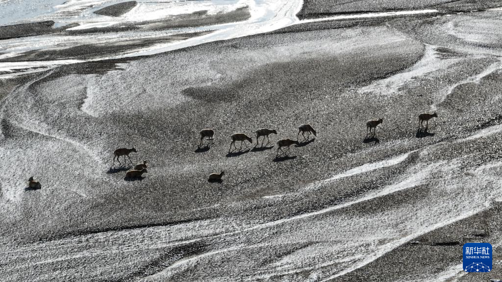 在甜水河畔荒灘雪地中向產(chǎn)羔地遷徙的藏羚羊(6月15日攝,無人機(jī)照片)。新華社記者 晉美多吉 攝
