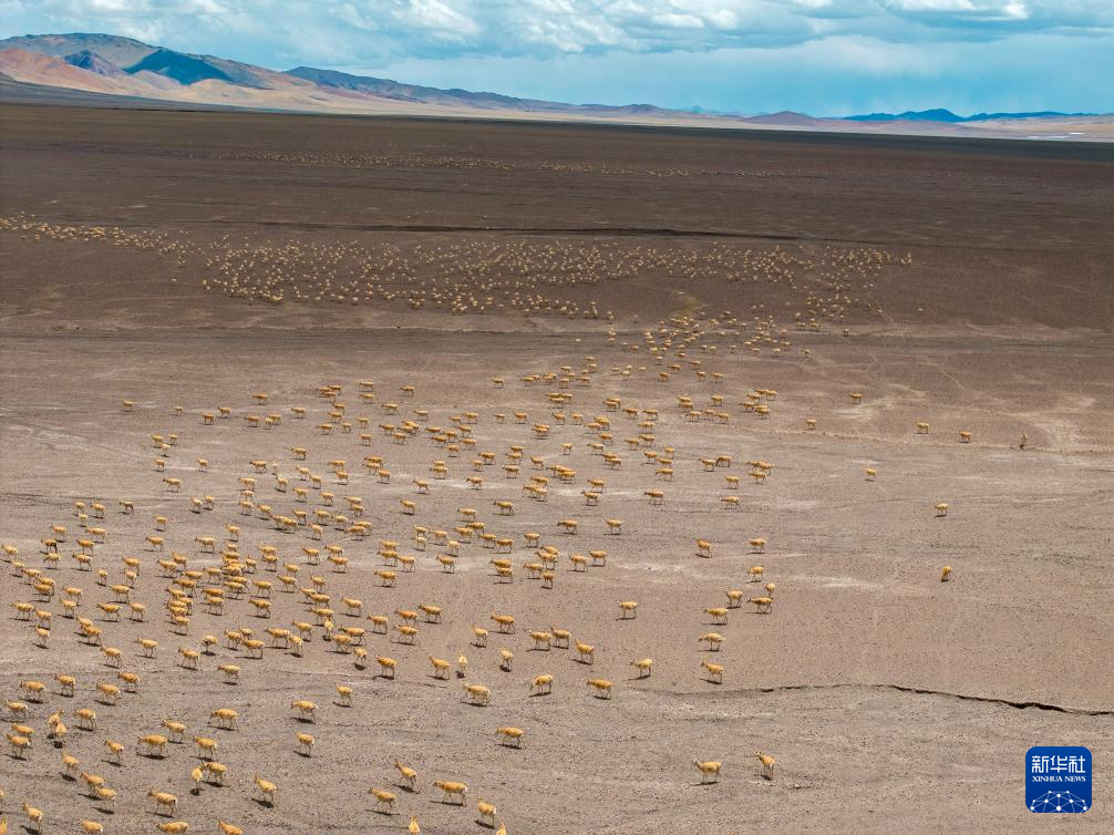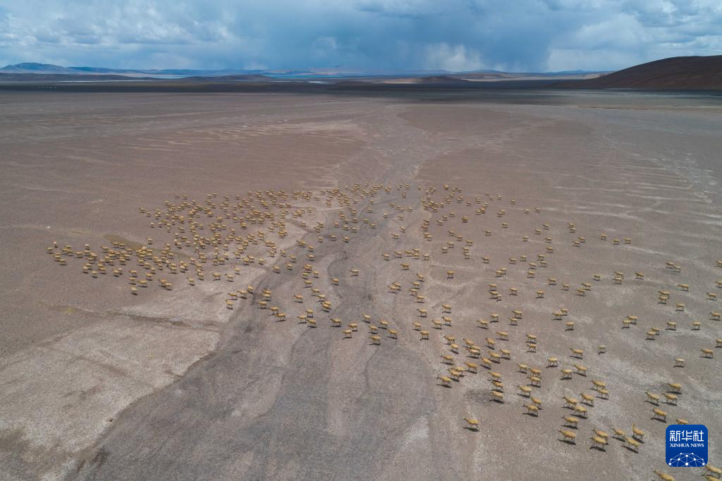 大群遷徙的藏羚羊在羌塘保護(hù)區(qū)核心區(qū)向產(chǎn)羔地遷徙(6月13日攝,無人機(jī)照片)。新華社記者 晉美多吉 攝