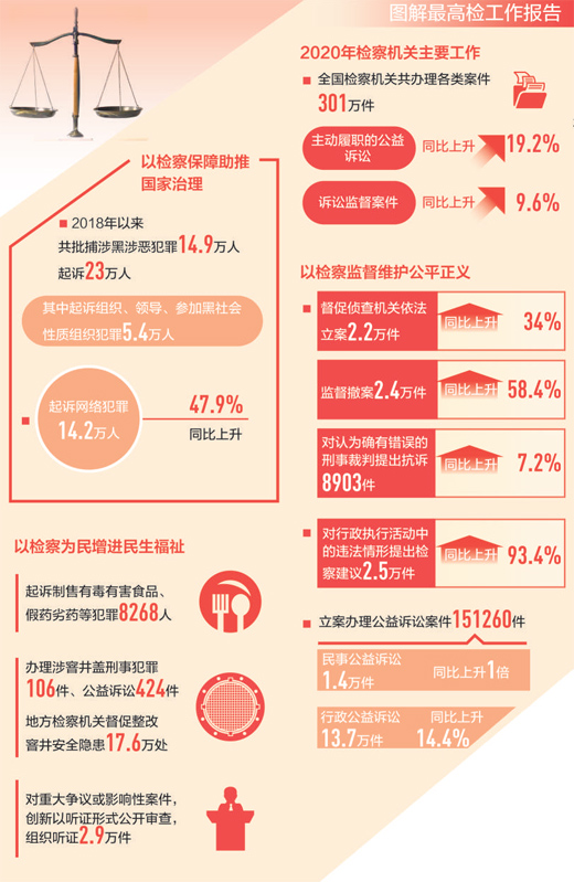 2020年,刑事檢察更加有力,民事檢察更為精準(zhǔn),行政檢察持續(xù)做實,公益訴訟檢察有序拓展,檢察機(jī)關(guān)在嚴(yán)格依法履職中促進(jìn)社會公平正義。