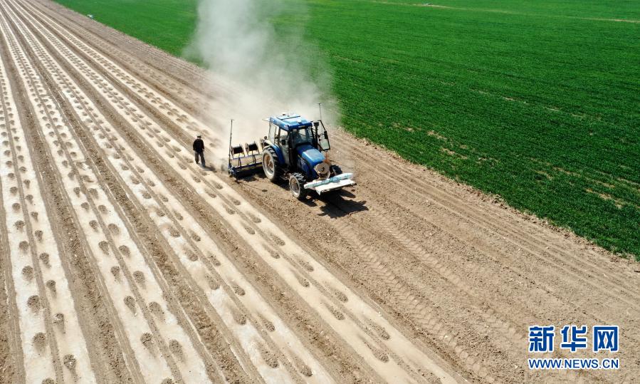 在新疆生產(chǎn)建設(shè)兵團(tuán)第六師共青團(tuán)農(nóng)場,一臺安裝北斗導(dǎo)航自動駕駛系統(tǒng)的播種機(jī)在播種棉花(2020年4月8日攝,無人機(jī)照片) 。新華社發(fā)(李華北 攝)
